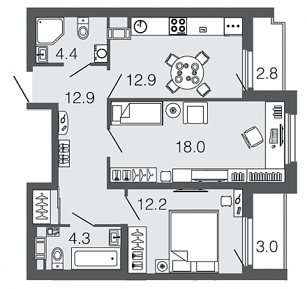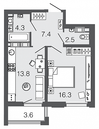 Узнать наличие и цены на квартиры 44,3 кв.м.
